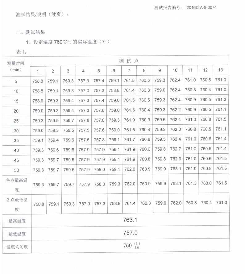 2016年9月上海檢測(cè)機(jī)構(gòu)對(duì)爐溫均勻性進(jìn)行了檢測(cè),實(shí)際溫度值均在±4℃內(nèi)范圍內(nèi),符合GB/T 9452-2012<熱處理爐有效加熱區(qū)測(cè)定方法》中規(guī)定的技術(shù)要求。